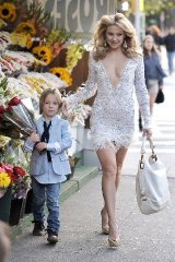 Great look, especially with the super low cut V ... just should've left the kid at home or did the photoshoot inside. That outfit, and with her kid. Just too weird. Of course it could have been worse, they could have done it inside. In a club. So I guess outside isn't that bad. Hit the jump.