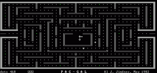A simple ASCII graphics Pac Man game. Plays pretty good even after all these years, even though on my computer when I grab the power pellets, the ghosts glow green for about a second or two making the game balls hard. Still, worth a download for those of you who are interested. It even has PC speaker music going. It's kinda like a VERY early version of the awesome Pac-Man C.E. with only one mode. You may need DOSBox for this one, and on my laptop I had to set the speed for 30000 for it to be playable. Although you can set the speed lower if you want more of a challenge.