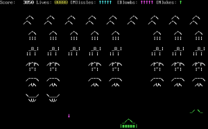 I hold text mode games in a special place, because for years that's the only type of graphics the computers I had access to could display. This changes the Space Invaders gameplay a little bit. In the first couple of levels that I played there were no barriers, so it's more like Galaga in the end, just without the Kamikaze ships raping you. But it adds new weapons to the mix. A nuke that clears the screen of enemies, a bomb that clears out the bottom row, and a missile that will cut through an entire column of them if timed just right. The only real problem is that it's a little difficult to control your ship. There's a slight delay when you press left or right. And the PC speaker sound is as annoying as anything else the PC speaker spits out. But once you get past that it plays pretty well considering what it is. Worth trying out at least once in any case, though it's doubtful it'll hold your interest for THAT long.