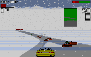Graphically, well, you can see from the screenshots that this uses the same type of racing style that Outrun uses. These types of games always have one glaring problem with me that's fortunately easily overlooked in the ones that are well done. And it's hard to describe. It's like the car is sitting still and the track itself is moving under you. Even more modern games like Need for Speed III : Hot Pursuit felt like that to me. But it doesn't keep me from loving these games. It's not as technologically impressive as, say, Outrun or Power Drift ... but those games are also done on much more powerful arcade hardware. But this game is still damned impressive graphically. The cars looks great, the tracks look great and the sense of speed is great. And it even has weather effects like rain and snow that do have an effect on how the car handles. Not to mention from time to time you'll find stuff in your way on the track that'll slow you down like rocks, puddles of water, logs, snow banks and various other things. The sprite scaling itself is top notch and the game really shows off the 256 color VGA palette perfectly.