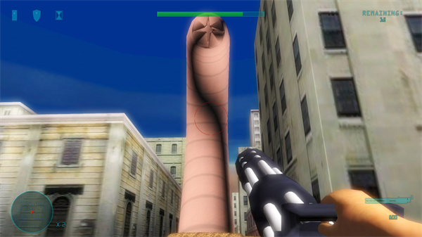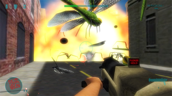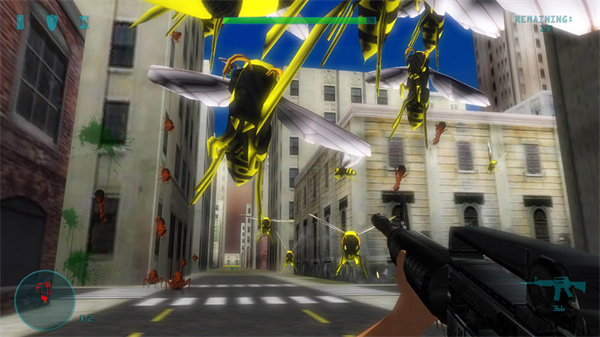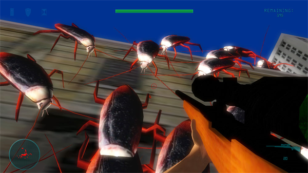 Like I said in my earlier trial impression, this was the first attempt at a real first person shooter for the XBL Indie Games. And it's actually not half bad once you get past the bad bits. You are Jonny Crush, and apparently the city has been overrun by aliens or aliens dumping off giant bugs. And I mean, these suckers are BIG. And there are LOTS of 'em (the game claims up to 1,000 per level, and I don't doubt it). You get various typical first person shooter weapons (and some not so typical) in your quest to eradicate every single bug. There's bugspray that is actually quite useful early in the game, an M4 Combine assault rifle, the trusty shotgun that will take out several of the weaker enemies in one shot up close, an SMG for when you want to shoot really fast ... but it's pretty weak. Then there's a sniper rifle that has 2 levels of zoom to it. I've never liked sniper rifles in games personally, but for something like this is a little different story. The trusty rocket launcher which is probably the most impressive weapon in the game. A minigun which is my personal favorite, high speed, high power, hell yeah. Then a weapon called Hammerhead that I haven't unlocked yet. But from th picture it looks like it could be some form of jackhammer.