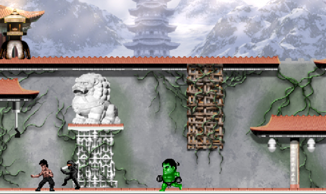 It plays identically to the previous Bruce Lee remake I put up here, but adds a whole bunch more, not the least of which are different styles in graphics. It's quite a bit heftier than the previous one ... standing in at 28MB decompressed, but it plays great and has great replayability due to the unlockables the game has to to offer. Right off the bat you are presented with 3 different graphical styles. The "Remake 2008" graphics which are redone in SNES/Genesis style pixel graphics while keeping the original animation (shown in the screenshot below), the original graphics, and a weird "Bruce Tron" that significantly changes the appearance and the sound of the game. I haven't (yet) unlocked everything, but I'm working on it. :)