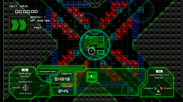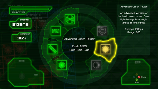 But with all the graphical polish, the gameplay is also great. It handles just fine with the controller. I won't get into all the little details here because if you're reading this you probably know how to play tower defense games. You place towers down to destroy the enemies before they get to your base. There are six different types of towers in the game. There's an EMP that will slow down enemies while they're within range of it, there's a Prism Tower that shoots a beam at a single enemy, and it can collect strength from up to 5 other towers near it. A Rail Tower that basically bombs the enemies and does some splash damage. Two different types of Laser Towers going from a basic one up to to an advanced one that has a frightening radius and deals a massive amount of damage. And my favorite, the Doom Tower. It's expensive as hell to build, takes up 4 spaces and is slow to reload, but when it fires you know it right away. Of course, to build the advaned laser tower and the Doom Tower, you need to build a Tech Center first, and once that's built you can use your money to research ways of making the various towers more powerful. All the towers but the EMP can be upgraded without the need of the Tech Center up to level 6. And the way it handles money is pretty neat too ... it obviously has interest levels you can raise from your headquarters, but if you don't have enough money to build something or upgrade something in the Tech Center, it'll queue it up on screen and take the money out as it's collected from the downed enemies. Which makes the game immensely more fast paced than the other ones I've tried and adds a level of strategy to an otherwise excellent game.