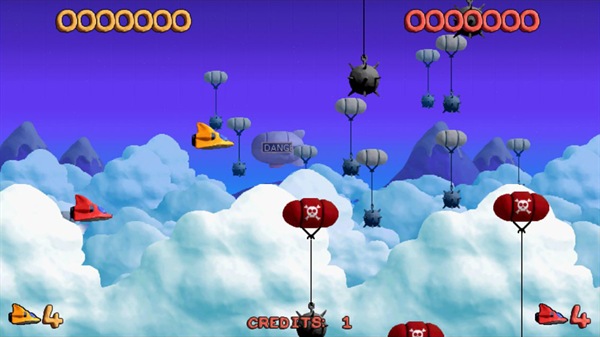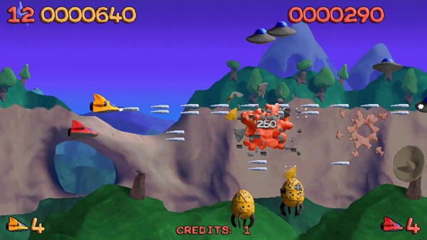 Graphically, the game is superb. Just about everything in the game is done via Claymation. And I’m not talking computer generated stuff here, I mean literal lumps of clay. Granted, they’ve been enhanced somewhat with Photoshop and blah blah blah, but almost everything from the backgrounds to the ships are done in Claymation. Hell, even the shots and explosions are done in this style and they look awesome. Some of the bigger enemies, when they explode you’ll see little guys bail out of the doomed ship, the closer they get to being destroyed, you can see the damage you’re doing. And the bigger enemies and bosses drop fruit. They drop FRUIT. It’s just incredible the amount of detail that has gone into the graphical style of this game. Even down to the numbers blending into one another when it calculates your high score. I would almost put it past Wallace and Grommit to be perfectly honest. Even the bloody smoke and clouds are done in that style. Not to mention everything is in 720p high definition.