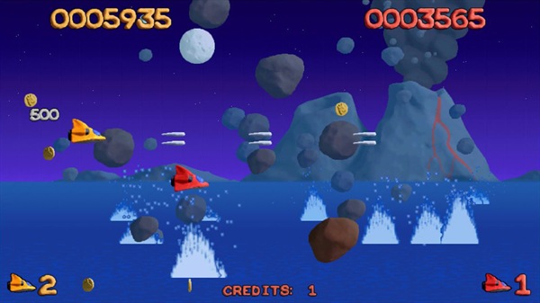 The gameplay and levels and whatnot, while done with near perfection are honestly not anything exceptional though. That’s not by any means saying that this game is bad of course. The developers didn’t try to reinvent the wheel, because with a game like this it doesn’t NEED to be reinvented. This style of gameplay has lasted for YEARS and I highly doubt it’ll EVER get hold. You use your right analog stick to move around and hit one of the face buttons to shoot. That’s it. There are various weapon powerups in the game that last for a finite amount of time such as Autoshot, a spread shot, missiles (that look bloody awesome in the graphical style this game comes in and pack one hell of a punch), a sonic pulse and a lightning gun. My personal favorite is the Autoshot just because I like to fill the screen with bullets, but they all definitely have their pros. The only one I find that I don’t really like is the sonic pulse because it’s range isn’t really all that great. But it makes up for it by destroying the enemy shots. And the lightning gun, while it doesn’t pack much of a punch, it’ll cut through and hit multiple enemies. Occasionally you’ll see crates floating up the screen by balloons, and if you manage to get the crate instead of the balloon like I usually do they’ll hold either gold coins that boost your score a little bit, a x2 multiplier for your score, or even better, 2 extra guns that revolve around your ship.