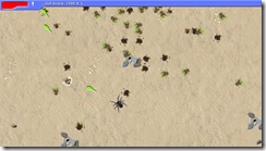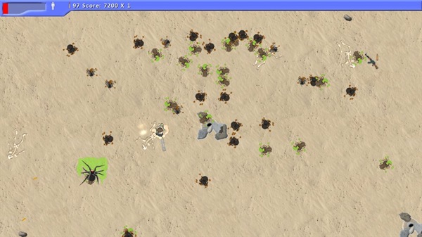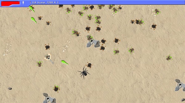 You’re a Rambo kinda dude with a machine gun going through an environment killing every spider in sight. There is no story because, well, arcade style games like this don’t need a story. Just insert one for yourself. Spiders come out of holes, you shoot them, you eventually come across a boss that shoots BACK that takes more hits than the normal ones and you proceed to the next level where you do it all over again, only with more spiders. Near as I can tell looking at the global high score list (yes, this game ACTUALLY has one) Spiders! is a lot like the games of old where you just go through wave after wave until you inevitably die … more than likely due to a whole bunch of the common spiders gangraping you than the end level boss. That’s it.
