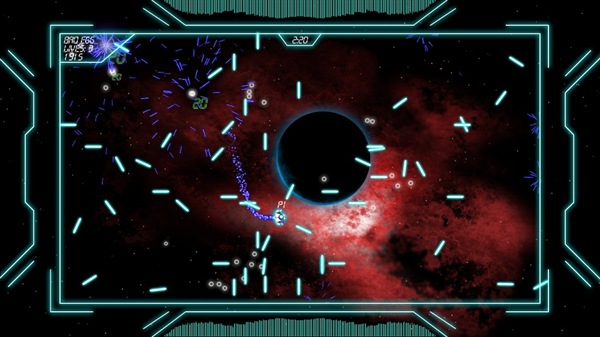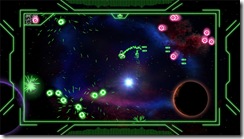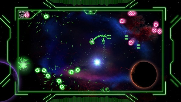 The graphics, despite the fact that they have a VERY strong similarity with another game are very well done and look great with bright vivid colors a dead solid frame rate that NEVER lets up, the enemies are easy to tell apart and everything has that real nice vector glow I loved back in the 80’s with games like Asteroids, Tempest, Battlezone and Red Baron. The border around the screen definitely adds to the game, because if all you saw way the play area, it’d be a bit overwhelming with everything that goes on and would make the nicely detailed environments seem a little TOO big. And, some people may knock this, but other people like me actually like the fact that the backgrounds are just static images. There’s enough going on during play without something like that being a distraction. The music flat out rocks and after playing it I just let it sit on the main menu for just that. The sound effects are great as well. Instead of explosions you get deep bass hits when the enemies are destroyed and through a decent speaker setup it really adds to the game overall. The only thing I’ve got to really knock the graphics for, is that my system is hooked to an older 480p TV and I play in widescreen, so the text is WAY too small to easily be read and I constantly have to strain to see it. It’s not a big deal, but there are people out there like me who haven’t moved up to the HDTV mess yet.