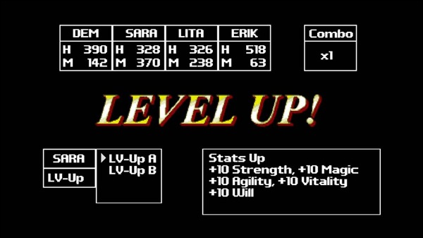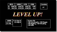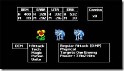 I won’t get too much into the battle system for this game because of the nature of this particular article and my complete lack of knowledge on the subject. I will say that it’s extremely simple to figure out and has a fair amount of depth in it’s simplicity. You can do regular old attacks, “Tech” attacks or magic attacks that do various things. Along with the typical spells that heal your characters or remove unwanted affects during battle. But on that same note, after every single battle your entire party, dead or alive, is COMPLETELY healed. Depending on how you like your RPGs that may be a good or bad thing, that’s entirely a personal choice in the matter. I personally love it because it helps to keep up the pace of the game. Now, mind you, right now I’m merely playing the game on Normal because in a game like this I save the other game modes and difficulties for after I either beat the game or at least get far enough along in it where I’m comfortable writing an actual review. Which … there’s a Score Attack mode that’s only unlocked after one beats the game anyway where you fight against bosses while underleveled.
