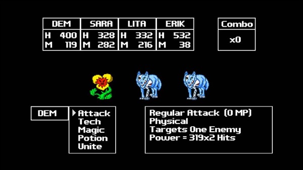I’ll start off with the overall presentation so far. The graphics in this game are just flat out AWESOME. The whole game is done in a very deliberate 8 bit style that I personally absolutely love. Though it’s not totally 8 bit … imagine the original Dragon Warrior or Final Fantasy games on the NES with the color palette of the SNES. Everything is very simple in animation and tile based, but the amount of detail in this pixel art is astonishing when you consider the style. Everything is in high definition, bright, colorful and smooth. When you get into one of the random battles (yes, the entire game is old school in style) it switches over to a black screen with just still pictures of the enemies that are drawn extremely well. When you hit them, they just flicker for a second and that’s about it. But aside from the well drawn enemies, the battles are a little TOO simplistic graphically. And some of the character portraits themselves honestly kind of suck. But those are small gripes on an otherwise graphically gorgeous game. The sound effects are done in that same 8 bit style like you would expect to hear out of the NES. Simplistic, but perfectly suited to the game. I don’t know if the authors of this game did the music themselves or got it off of the site that is named in the credits. But kudos to whoever did the music because it’s great. But there’s not a whole lot OF it … I heard the same track repeated in several different areas … and while it IS good it does get a little old.